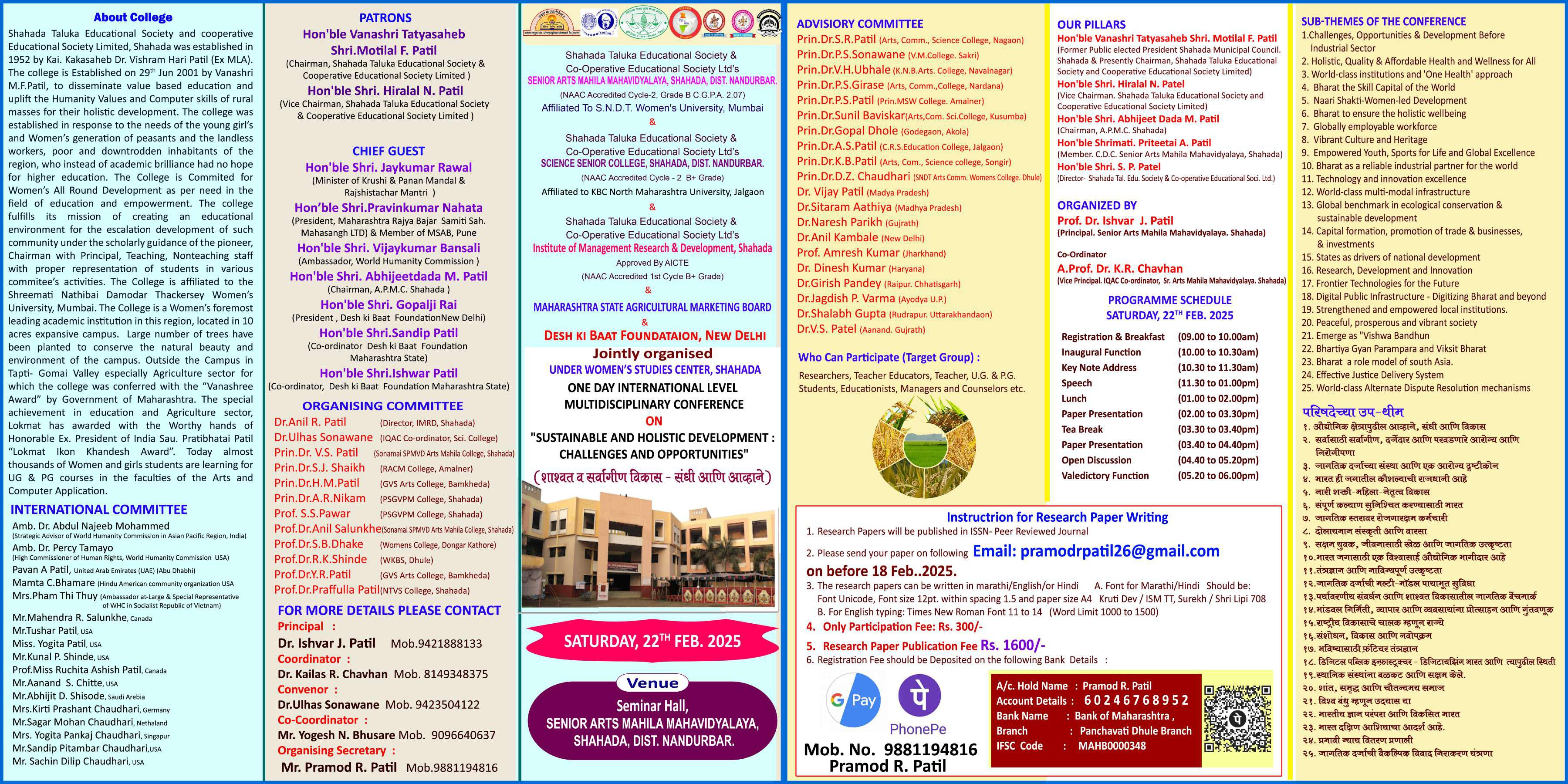On behalf of the managing committee of S. N. D. T. Sr. Arts Mahila Mahavidyalaya, Shahada. I extend a hearty welcome to you on this beautiful, sacred campus & to our website as well. This campus of higher learning is famous as "Vishram Kaka Shaikshanik Sankul". The city Shahada is situated close to the ‘Satpuda’ mountain ranges & valley of Tapi river. Young friends, I am in no doubt that the ambience of this campus will fulfill your long cherished dream of acquiring excellence in the field of higher education.